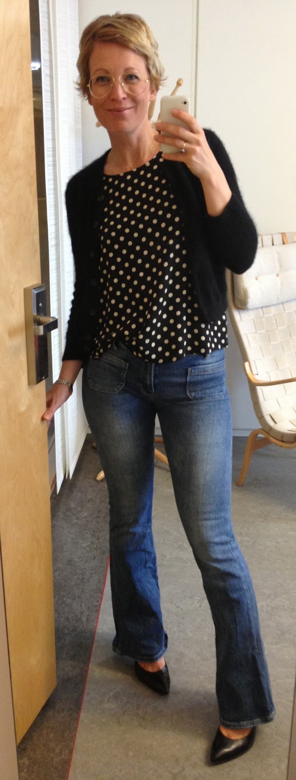 Svart- och vitprickig sidenblus Greta, jeans Zara, svart angorakofta Acne, svarta klackar Rizzo