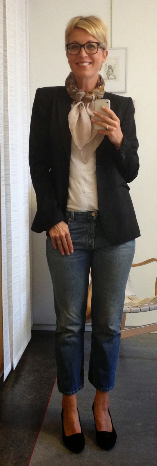 Vit top Acne, jeans Acne, svart kavaj Filippa K, svarta klackar Filippa K, sjal Beck Söndergaard